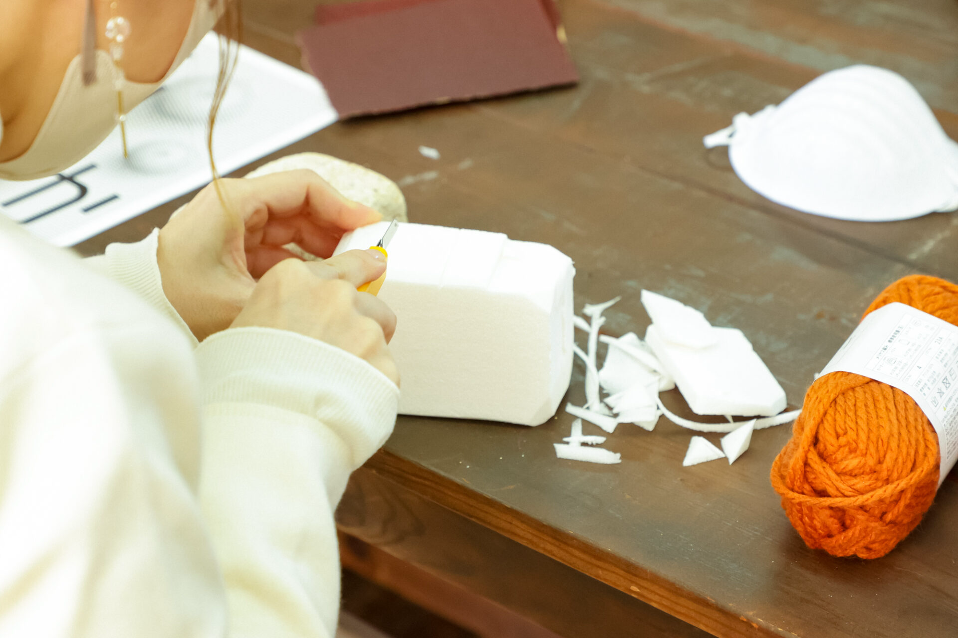 さて、肝心のワークショップはこのように進んだ。まず参加者はホームセンターなどでよく見る軽量レンガを丁寧に観察して、似た大きさの発泡スチロールのブロックを削り、同じ形を作るように指示される。作品制作の基本的なトレーニング、模刻を体験する。これは見てとらえた形を手によって再現する一見単純な行為だが、素材の硬さや道具の扱いに慣れるまでのあいだ、自分の手はまるで他者のように言うことを聞かない。しかし、次第にナイフと紙やすりの扱いに慣れていくと、もっと細部を再現したい欲求に駆られる。映像でも、はじめの戸惑いから一変して集中力が増していく様子が短時間で見て取れる。
