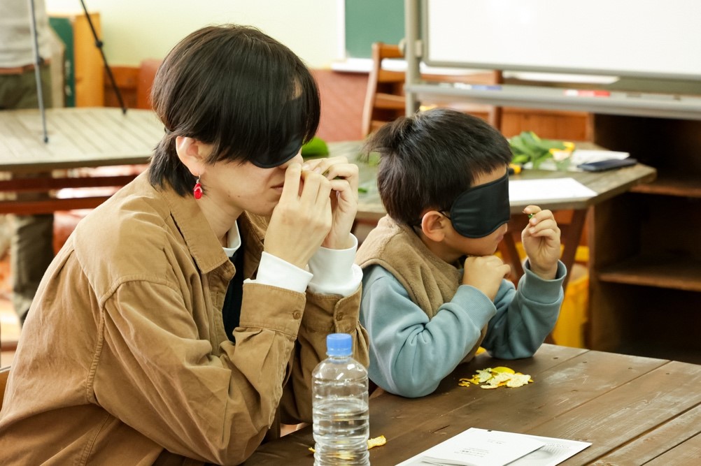 匂いは拡散してく特性があるため、感覚の中でも特に嗅覚は他の感覚器官に比べて主観的で性差や個人差も大きくなります。そこで、実際に視覚を遮断し嗅覚のみによる体験をしていきます。みかんの香りをテーマにこの感覚を研ぎ澄ます体験を行いながら、嗅覚における自他が混じり合うような特徴を体験できるようなワークショップです。
